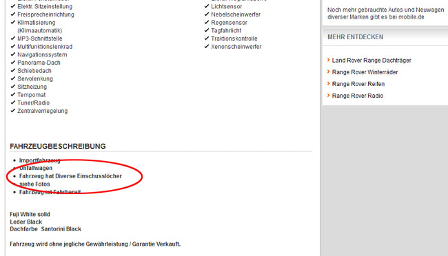 Περίεργες… αγγελίες με μεταχειρισμένα αυτοκίνητα δεν υπάρχουν μόνο στην Ελλάδα αλλά και στο εξωτερικό. Συγκεκριμένα, στην σελίδα mobile.de, υπάρχει προς πώληση ένα σχετικά καινούργιο Range Rover (4.510 χλμ.) με 340 ίππους το οποίο έχει ένα…μειονέκτημα.