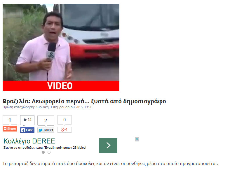 Λεωφορείο παρασέρνει γυναίκα σε διάβαση πεζών μπροστά στα έντρομα μάτια αυτόπτων μαρτύρων. Η άτυχη γυναίκα επιταχύνει το βήμα σε μια απέλπιδα προσπάθεια να αποφύγει το μοιραίο, χωρίς όμως αποτέλεσμα. Το απίστευτο συμβάν σημειώθηκε την 1η Μαΐου. Δεν υπάρχουν πληροφορίες για την κατάσταση της γυναίκας.