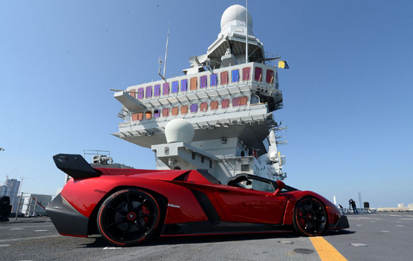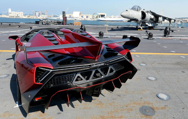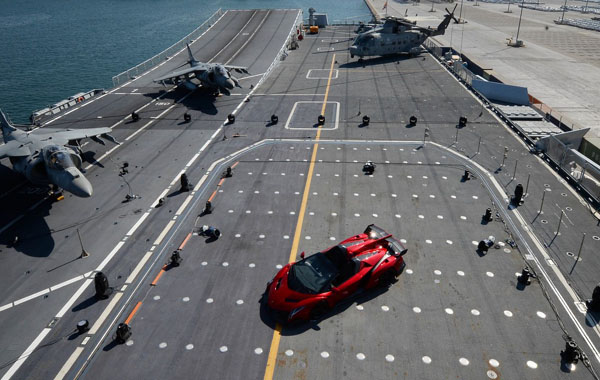 Την πρώτη της δημόσια εμφάνιση, πάνω στο ιταλικό αεροπλανοφόρο «Nave Cavour» έκανε η εντυπωσιακή Veneno Roadster, στον κόλπο του Αμπού Ντάμπι.
