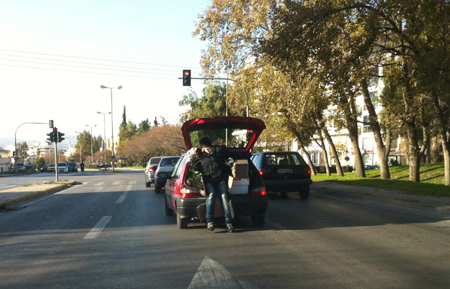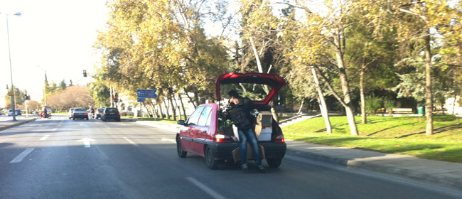 Όπως θα παρατηρήσετε, στο πορτ μπαγκάζ ενός αυτοκινήτου κάθεται ένας άνθρωπος καθώς δεν υπάρχει χώρος γι’ αυτόν εντός του οχήματος! Μάλιστα είναι τόσο στριμωγμένος, που χωρά ίσα – ίσα, ενώ για να έχει και αίσθηση του τι γίνεται, ελέγχει και το χώρο μπροστά. Σαφώς και κάτι τέτοιο απαγορεύεται αλλά τι θα συνέβαινε στην περίπτωση που ένα άλλο όχημα έπεφτε πάνω σε αυτό που κάνει τις… μεταφορές;
