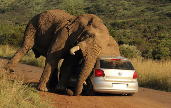 Τυχεροί μέσα στην ατυχία τους στάθηκαν δύο άνθρωποι στο Εθνικό Πάρκο Pilanesburg της Νότιας Αφρικής, όταν είδαν έναν ελέφαντα να κατευθύνεται προς τα πάνω τους και να ορμάει στο αυτοκίνητο όπου επέβαιναν.