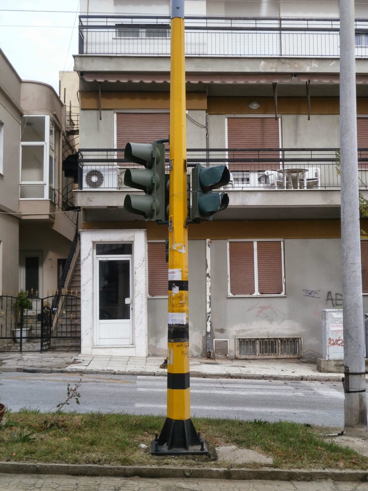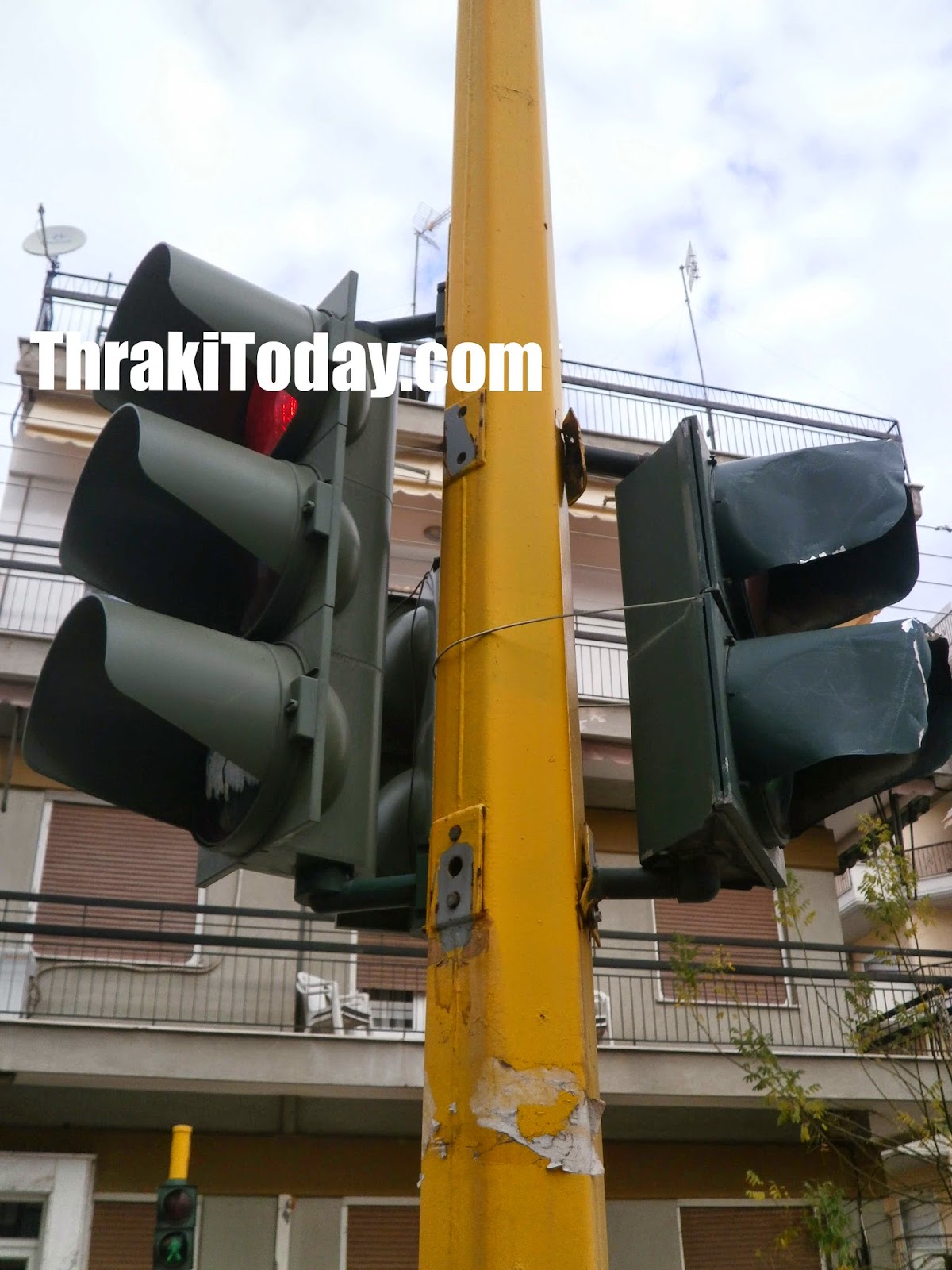 Με ένα κομμάτι σύρμα συγκρατείται φωτεινός σηματοδότης που βρίσκεται επί τη συμβολή των οδών Περικλέους και Πραξιτέλους στην Ξάνθη.