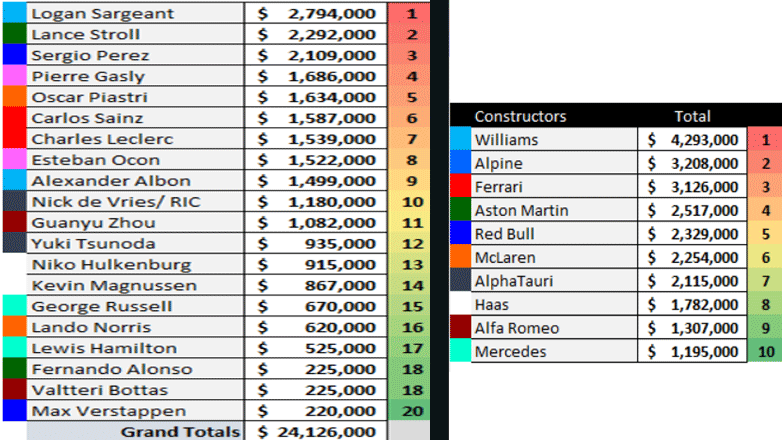 Ο πιο απρόσεκτος και κοστοβόρος οδηγός μέχρι τώρα είναι ο Αμερικάνος Logan Sargeant της Williams ο οποίος έχει κοστίσει μέχρι τώρα στην ομάδα του περίπου 2.8 εκατ. δολάρια σε επισκευές. Για να καταλάβετε το μέγεθος, οι ετήσιες απολαβές από το συμβόλαιο του είναι 1 εκατ. δολάρια.