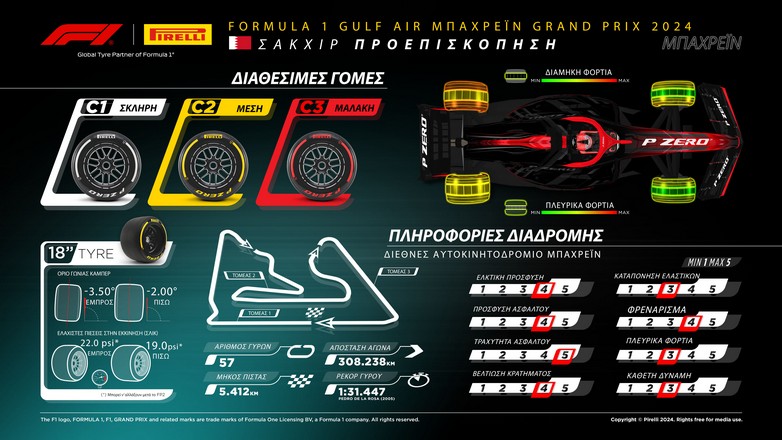 Το οδόστρωμα είναι τραχύ και αποτελούν κλειδί για την απόδοση η ελκτική πρόσφυση στην έξοδο των αργών στροφών και η σταθερότητα στο φρενάρισμα. Η βελτίωση του κρατήματος της αγωνιστικής γραμμής είναι κάπως περιορισμένη. Σημαντικό ρόλο σε αυτό παίζει η θερμοκρασία αλλά και ο άνεμος ο οποίος συχνά φέρνει από την έρημο άμμο στην πίστα και τα ελαστικά χάνουν την πρόσφυση. Ακόμη η πτώση απόδοσης των ελαστικών λόγω υπερθέρμανσης, μπορεί να οδηγήσει σε διαφορετικές στρατηγικές και δημιουργεί επίσης ενδιαφέρουσες διαφορές στις επιδόσεις.