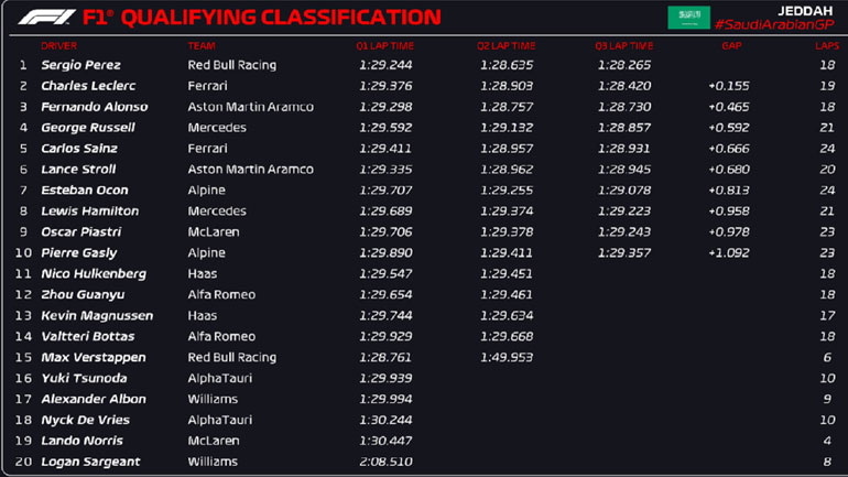 Ο Perez σημειώνοντας 1.28.265 στο Q3 διεκδίκησε και πήρε την pole για 0,155 δευτερόλεπτα μπροστά από τον αντίπαλο του Charles Leclerc, ο οποίος θα χάσει 10 θέσεις λόγω ποινής που δέχτηκε για την αλλαγή κινητήρα. Λόγος για τον οποίο δεύτερος στην εκκίνηση να βρεθεί ο Fernando Alonso.