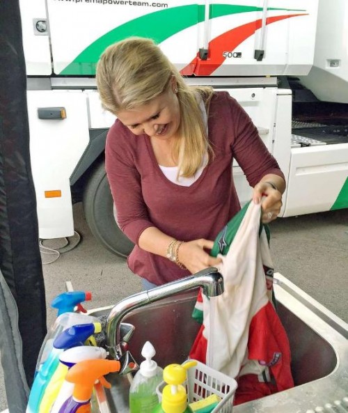 Μάλιστα, η Corina Schumacher δεν δίστασε να βάλει μπουγάδα πίσω από το motorhome της ομάδας που αγωνίζεται ο γιος της και να πλύνει τη φόρμα του. Η 47χρονη πήρε σαπούνι και νερό για να φρεσκάρει τη στολή του Mick, καθώς έγινε ένα μπέρδεμα με τις φόρμες και ο μικρός είχε μόνο μια διαθέσιμη. Όπως φαίνεται από τη φωτογραφία, η 47χρονη το διασκέδασε αρκετά.