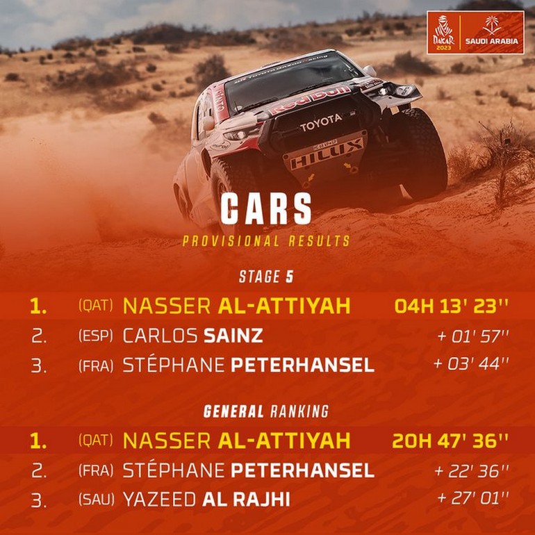 Η σημερινή ημερά (5/1/23) συνεχίστηκε με αμείωτο ρυθμό στις αφιλόξενες εκτάσεις της Σαουδικής Αραβίας. Το πρόγραμμα του αγώνα περιελάβανε την 5η ειδική διαδρομή Ha’il > Ha’il μήκους 373 αγωνιστικών χιλιομέτρων. Η έξοδος του Γάλλου S.Loeb έδωσε μια γερή ανάσα στο πλήρωμα του Toyota Hilux T1+.