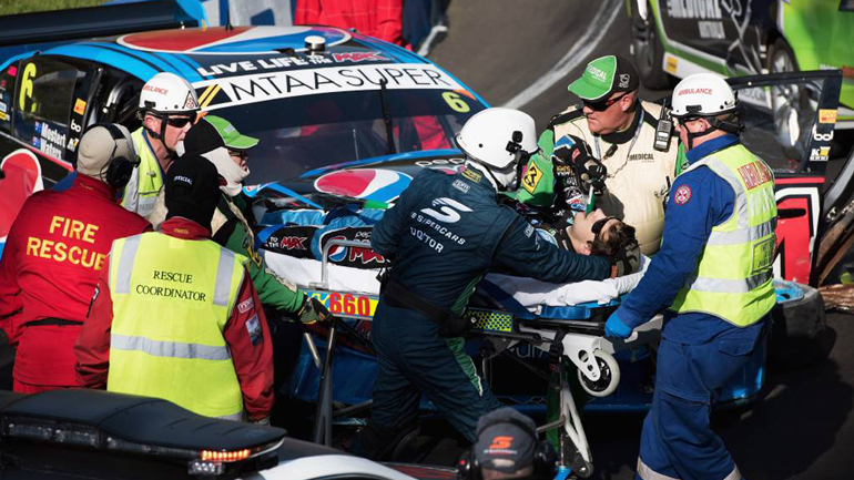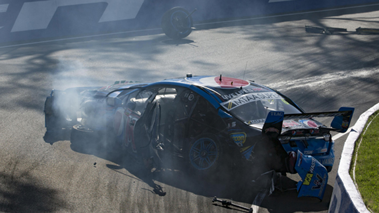 Ο 23χρονος οδηγός και νικητής του αγώνα πέρυσι, έχασε τον έλεγχο του θηριώδους V8 supercar κατά τη διάρκεια των δοκιμαστικών, με αποτέλεσμα το όχημα να χτυπά ανεξέλεγκτο στους προστατευτικούς τοίχους.