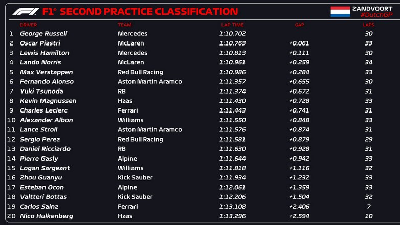 Στις τέσσερις πρώτες θέσεις η σειρά ήταν Mercedes 1-3 και McLaren 2-4. Δείτε τη γενική κατάταξη στο F1 Practice 2