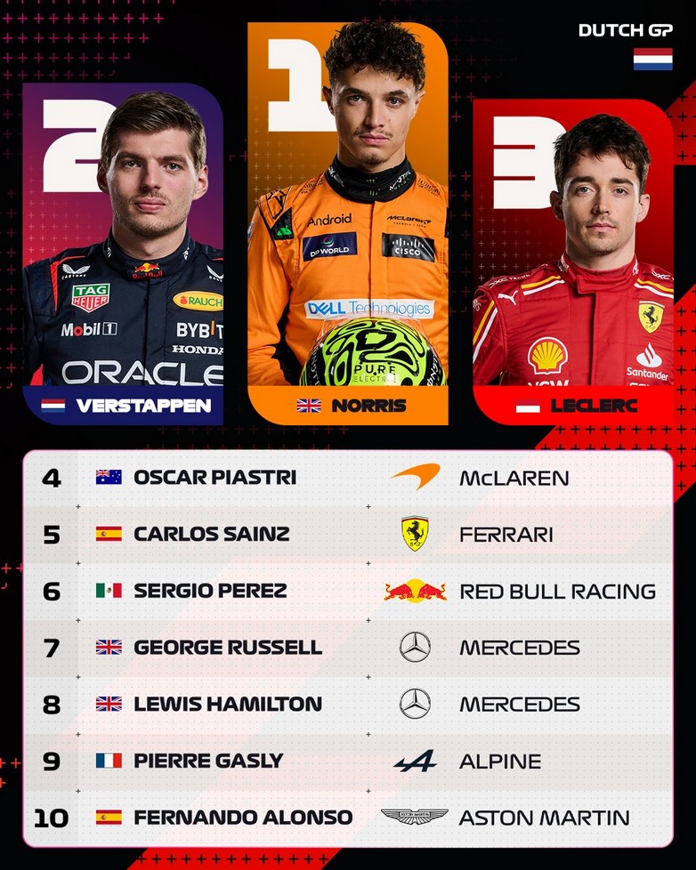 O Lando Norris δεν άφησε δικαιώματα αμφισβήτησης και πήρε μία ακόμη Pole Position (την 4η της καριέρας του) δείχνοντας πως είναι ο μεγάλος αντίπαλος πλέον του Verstappen, ακόμα και μέσα στην πατρίδα του. Ο Ολλανδός με τη σειρά του ξεκινά από την 2η θέση έχοντας πίσω του τη δεύτερη McLaren του Oscar Piastri. Στην 4η θέση ο Russell και στην πέμπτη ο Perez.