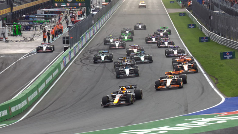 Τα πέντε φώτα έσβησαν και τα μονοθέσια ξεκίνησαν. Ο Norris δεν θα κάνει καλή εκκίνηση και ο Verstappen θα καταφέρει ήδη από την 1η στροφή να πάρει την πρωτιά. Μάλιστα και ο τρίτος Oscar Piastri θα χάσει τη θέση του από τον τέταρτο Russell. Καταστροφική εκκίνηση για τις δύο McLaren που φαίνεται υπό πίεση να «κομπλάρουν», με τον Verstappen να προσφέρει στους θεατές αυτό που πραγματικά περίμεναν. Ένα προσπέρασμα ήδη από την πρώτη στροφή.