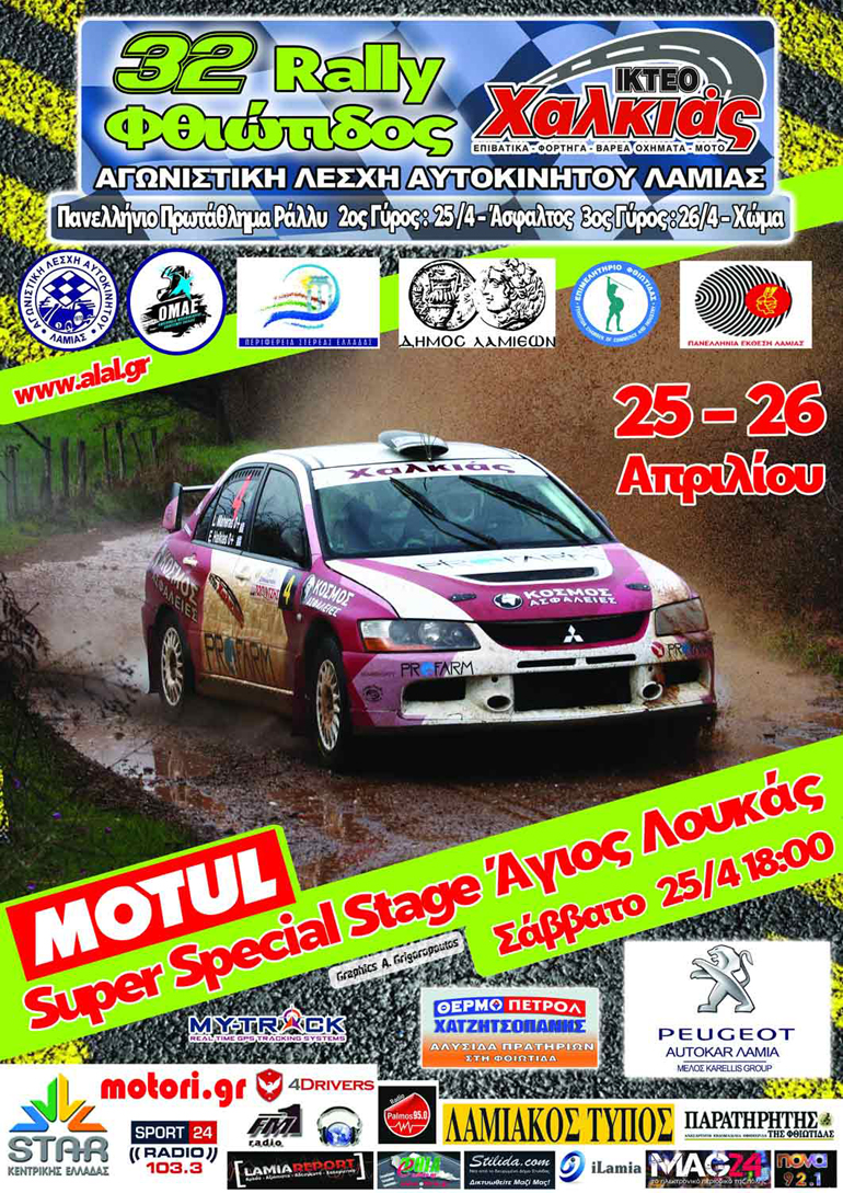 Το Σαββατοκύριακο 25-26 Απριλίου διεξάγεται ο 2ος και 3ος γύρος του πανελληνίου πρωταθλήματος ράλι. Πρόκειται για το 32ο Ράλι Φθιώτιδος “Ι ΚΤΕΟ Χαλκιάς” το οποίο αποτελείται από δύο αγώνες που είναι προγραμματισμένοι να γίνουν σε ασφάλτινες και χωμάτινες ειδικές διαδρομές. Σύμφωνα με τους διοργανωτές 36 πληρώματα θα τρέξουν την πρώτη ημέρα και 29 την δεύτερη (50 στο σύνολο, 15 θα τρέξουν και τις δύο ημέρας) καθώς η κάθε αγωνιστική ημέρα προσμετρά ξεχωριστά στο αγωνιστικό ημερολόγιο.
