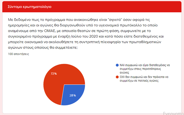 «Με δεδομένο πως το πρόγραμμα που ανακοινώθηκε είναι “σφιχτό” όσον αφορά τις ημερομηνίες και οι αγώνες θα διοργανωθούν υπό το υγειονομικό πρωτόκολλο το οποίο αναμένουμε από την ΟΜΑΕ, με απουσία θεατών σε πρώτη φάση, συμφωνείτε με το συγκεκριμένο πρόγραμμα με έναρξη Ιούλιο του 2020 και κατά πόσο είστε διατεθειμένος και μπορείτε οικονομικά να ακολουθήσετε τη συντριπτική πλειοψηφία των πρωταθληματικών αγώνων στους οποίους θα συμμετέχετε;». Το 72% των ερωτηθέντων διαφώνησε με την έναρξη των αγώνων από τον Ιούλιο και απάντησε αρνητικά στη συμμετοχή στους περισσότερους αγώνες. Σε ποσοστό 28% οι συμμετέχοντες συμφώνησαν με το πρόγραμμα του 2020 και εξέφρασαν την επιθυμία να συμμετέχουν σε πολλούς αγώνες.