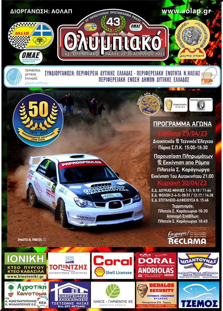 Το διήμερο 29 και 30 Απριλίου 44 πληρώματα θα πάρουν μέρος στην πρεμιέρα του Πανελληνίου Πρωταθλήματος Ράλλυ Χώματος στο Νομό Ηλείας. Η αυλαία του κορυφαίου θεσμού αγώνων ράλλυ στη χώρα μας ανοίγει με το 43ο Ολυμπιακό Ράλλυ.