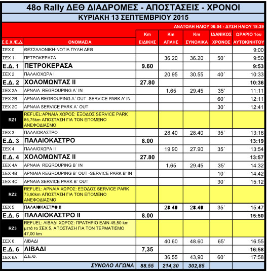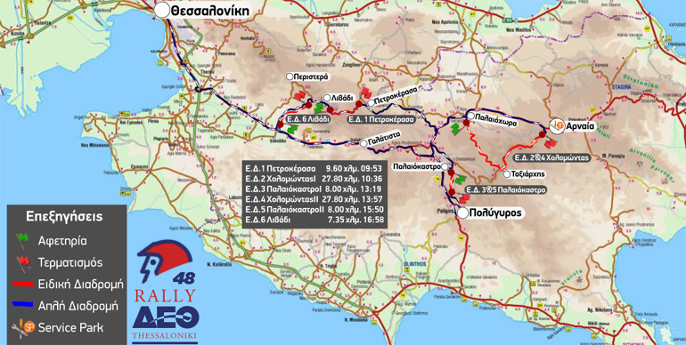 Επίκεντρο του ράλι είναι ως είθισται η Θεσσαλονίκη και πιο συγκεκριμένα ο χώρος που φιλοξενείται παραδοσιακά η Διεθνής Έκθεση Θεσσαλονίκης (Δ.Ε.Θ.). Το καθαρά αγωνιστικό κομμάτι ξεκινά για τους συμμετέχοντες από τη Νότια Πύλη της Δ.Ε.Θ. στις 09.00, για να τερματίσουν εκεί στις 17.58, αφού πρώτα θα έχουν αγωνιστεί σε 6 ειδικές διαδρομές μήκους 88.55 χιλιομέτρων.