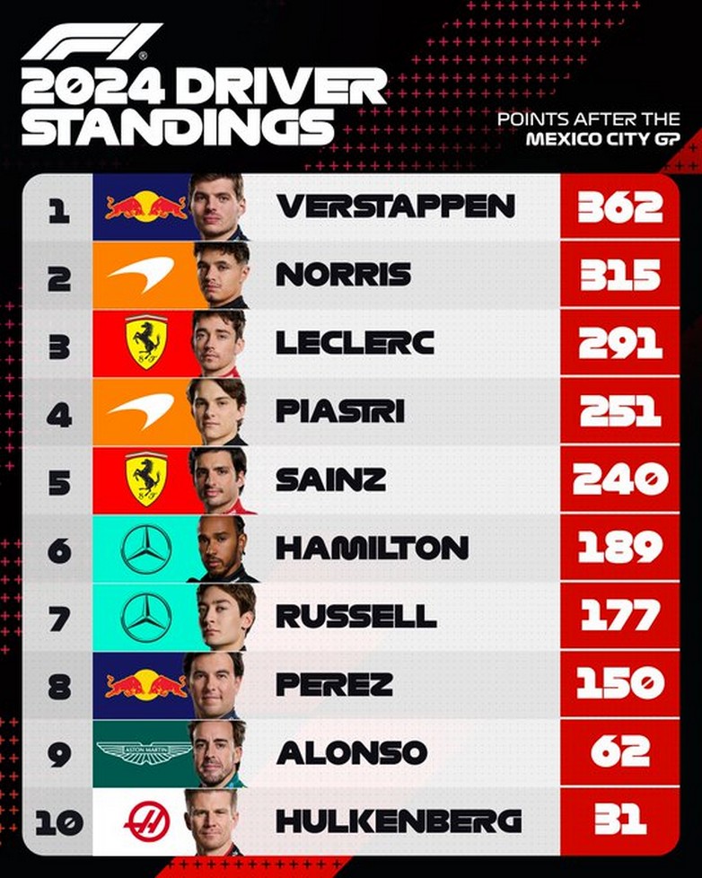 Μετά τον αγώνα στο Μεξικό η βαθμολογία στους οδηγούς διαμορφώθηκε ως εξής:
