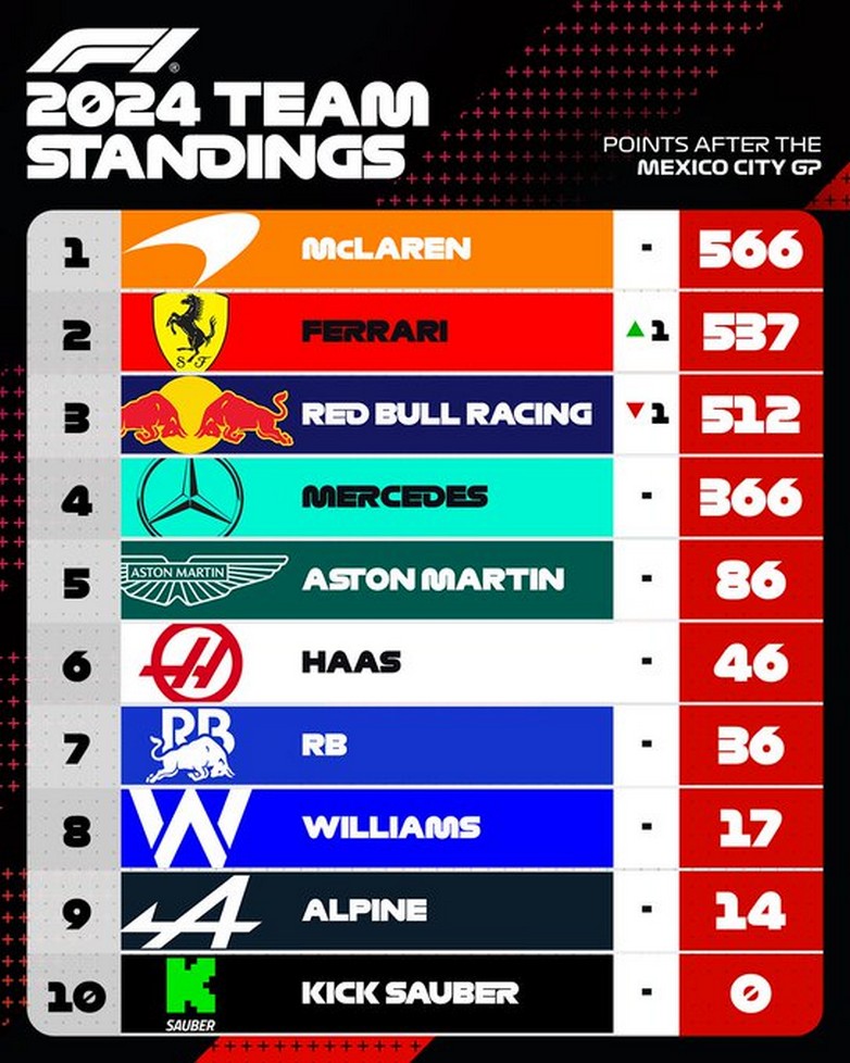 Αντίστοιχα η βαθμολογία στους κατασκευαστές δείχνει υπεροχή της McLaren. H Red bull απο την 1η θέση πέρασε στην 3η μετά τη νίκη της Ferrari στο Μεξικό. H αυστριακή ομάδα δεν βοηθήθηκε καθόλου απο την απογοητευτική συμμετοχή του Sergio Perez στον αγώνα στο Μεξικό.