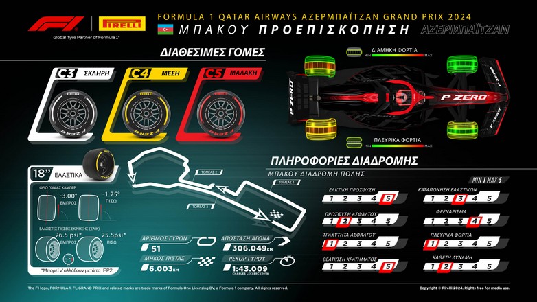 Πολλά θα εξαρτηθούν και από την επιλογή της γόμας που θα κάνουν οι επικεφαλής των ομάδων. Η Pirelli όταν γίνεται αγώνας σε διαδρομή σε δημόσιους δρόμους, επιλέγει τις πιο μαλακές γόμες. Στην περίπτωση αυτή για τον αγώνα στο Μπακού επέλεξε τις τρεις πιο μαλακές γόμες της γκάμας, τη C3 ως σκληρή, τη C4 ως μέση και τη C5 ως μαλακή.