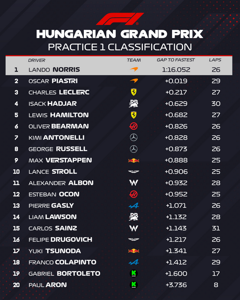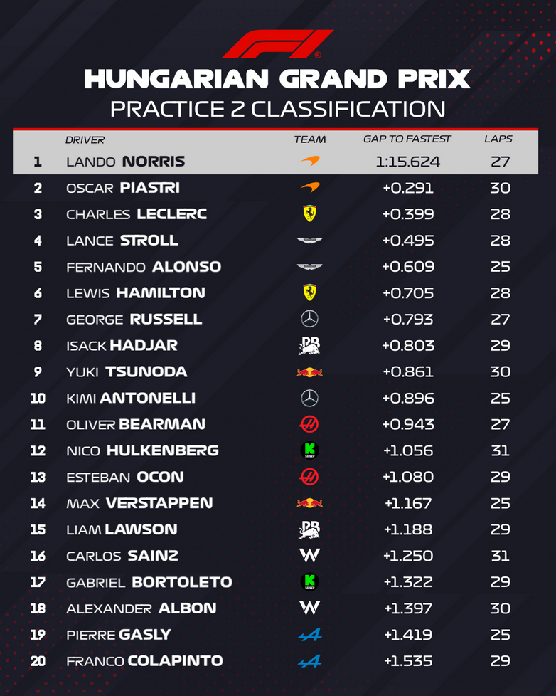 O Lando Norris ήταν και στα δύο ελεύθερα δοκιμαστικά πρώτος. Προσπάθησε ο ομόσταυλός του Oscar Piastri να κάνει καλύτερο χρόνο αλλά τελικά -αφού έτσι και αλλιώς οι χρόνοι στα ελεύθερα δοκιμαστικά δεν μετράνε πουθενά- αρκέστηκε στη δεύτερη θέση. Οι δύο οδηγοί της McLaren σημείωσαν τους καλύτερους χρόνους, είτε με την μέση είτε με την μαλακή γόμα.