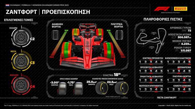 Για τον αγώνα στην Ολλανδία, η Pirelli επέλεξε μια πιο μαλακή γκάμα γομών σε σχέση με πέρυσι. Οι ομάδες θα έχουν στη διάθεσή τους την C2 ως σκληρή γόμα, την C3 ως μέση γόμα και την C4 ως μαλακή γόμα, ενώ το 2024 οι διαθέσιμες γόμες ήταν η C1, η C2 και η C3.