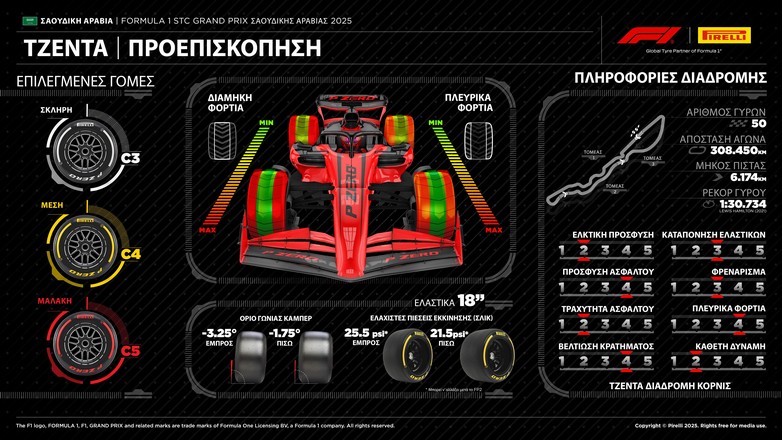 Η επιλογή γομών για τους πρώτους τέσσερις αγώνες αυτής της σεζόν ήταν η ίδια με πέρυσι, αλλά για τον πέμπτο γύρο, η Pirelli έχει κάνει ένα βήμα προς το μαλακό άκρο. Έτσι η τριάδα που θα είναι διαθέσιμη στην Τζέντα έχει: Σκληρή γόμα τη C3, μέση γόμα τη C4 και μαλακή γόμα τη C5. Αυτό είναι εναρμονισμένο με το στόχο, που έχουν θέσει η FIA, η F1 και οι ομάδες για να δημιουργήσουν περισσότερες επιλογές στρατηγικής και επομένως πιο συναρπαστικούς και απρόβλεπτους αγώνες. Στις τέσσερις προηγούμενες διοργανώσεις αυτού του Grand Prix, η μια αλλαγή κυριάρχησε, τόσο όσον αφορά στην αποτελεσματικότητα όσο και στην προτίμηση των ομάδων, ακόμη και όταν το αυτοκίνητο ασφαλείας ανακάτευε λίγο τα πράγματα.