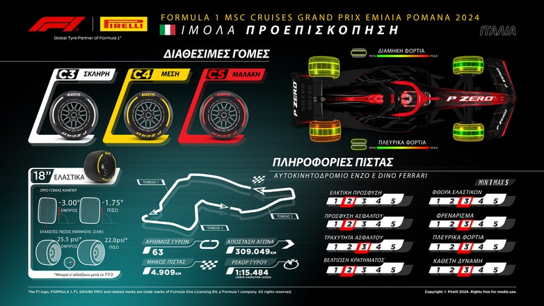 Για τον αγώνα αυτό φέτος, η Pirelli επέλεξε τις τρεις πιο μαλακές γόμες της γκάμας της για στεγνό οδόστρωμα: C3 ως σκληρή, C4 ως μέση και C5 ως μαλακή. Είναι η πρώτη φορά που αυτή η τριάδα θα χρησιμοποιηθεί στην πίστα της Emilia. Ίδια επιλογή είχε γίνει και πέρυσι που ακυρώθηκε ο αγώνας. Το 2022, οι επιλεχθείσες γόμες ήταν C2, C3 και C4.