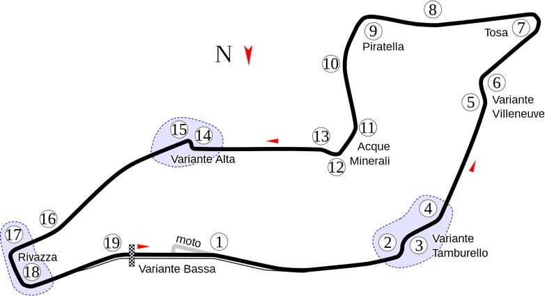 Η Ίμολα έχει μήκος 4.909 μέτρα, αποτελείται από 19 στροφές και διαθέτει μόλις μία ζώνη DRS. Στο Grand Prix της Κυριακής οι οδηγοί θα διανύσουν 63 γύρους δηλαδή θα καλύψουν 309.049 χιλιόμετρα. Το ρεκόρ πίστας με χρόνο 1.15.484 έχει κάνει ο Hamilton. Τις περισσότερες νίκες στην πίστα έχει ο Michael Schumacher.