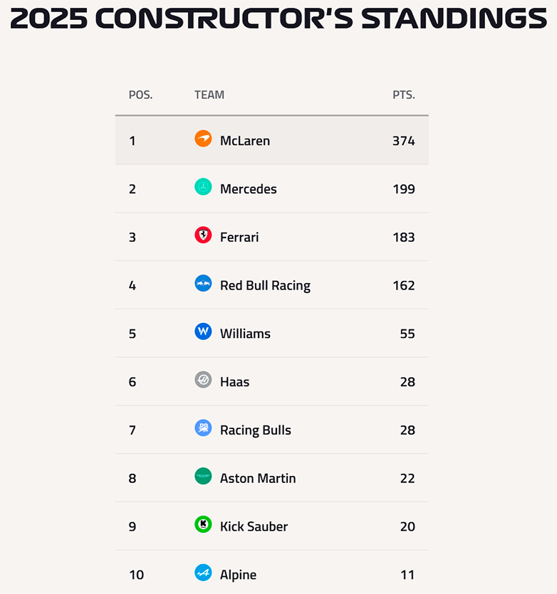 Στη βαθμολογία των κατασκευαστών τα πράγματα είναι πιο ομαλά. Η McLaren έχει καλή απόσταση ασφαλείας και δεν αλλάζει τη στρατηγική της.