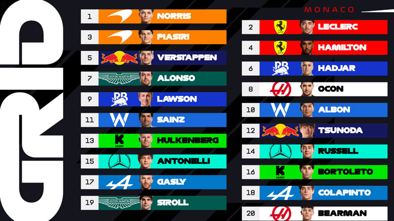 Η σειρά εκκίνησης για τον αγώνα που ξεκινά σήμερα στις 16:00 και θα μεταδοθεί, τόσο από το ελεύθερο κανάλι του ANT1, όσο και από το Ant1+. (Ο Hamilton στην 7η θέση και έτσι ανεβαίνουν από μία θέση οι Verstappen, Hadjar, Alonso).