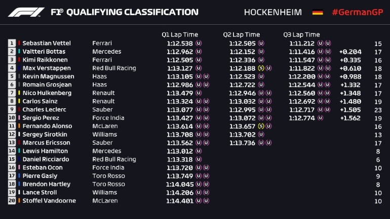 Πολύ δυνατός στις κατατακτήριες δοκιμές του γκραν πρι της Γερμανίας αποδείχτηκε ο Sebastian Vettel ο οποίος για 55η φορά στην καριέρα του κατάφερε να κατακτήσει την Pole Position.