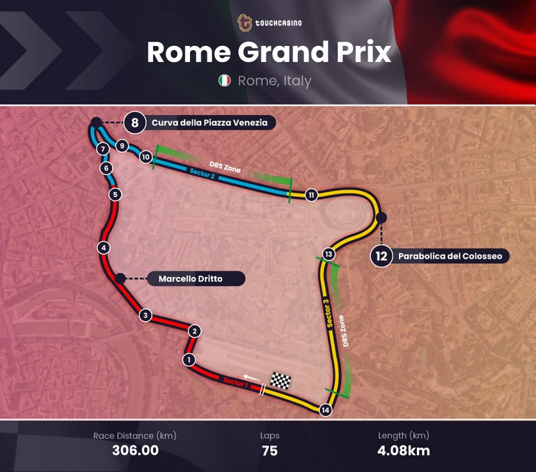Χρησιμοποιώντας το Google Earth, το TouchCasino.com έφερε στη ζωή μια ιταλική πίστα δρόμου με ένα Grand Prix της Ρώμης που εκτείνεται σε πάνω από 4,08 χιλιόμετρα, απαιτώντας συνολικά 75 γύρους.