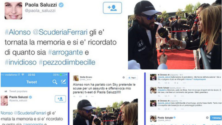 Το σχόλιο της προκάλεσε έντονες αντιδράσεις και η κυρία Saluzzi ζήτησε συγνώμη, σβήνοντας άμεσα το tweet. Όμως, το ιταλικό κανάλι που έχει τα δικαιώματα της F1 δεν της το συγχώρεσε και την έθεσε σε διαθεσιμότητα. Όσο για τον Alonso, δεν έχει κάνει καμία σχετική δήλωση προς το παρόν, αν και στο GP της Κίνας αρνήθηκε να μιλήσει στους δημοσιογράφους του συγκεκριμένου τηλεοπτικού σταθμού.