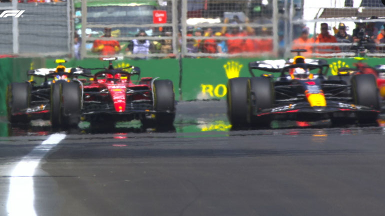 Πράγματι, με τη χρήση του DRS στον 4ο γύρο ο Ολλανδός θα καταφέρει να περάσει σαν σταματημένο τον Leclerc και θα βρεθεί στην αγαπημένη του θέση, την 1η. Δύο γύρους αργότερα ο Leclerc θα γίνει θεατής στο ίδιο έργο, με τον δεύτερο οδηγό της Red Bull, Sergio Perez να τον περνάει επίσης με τη χρήση του DRS.