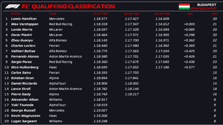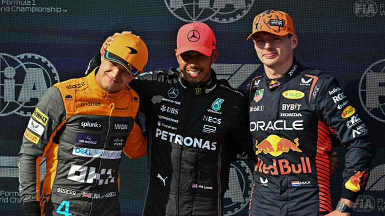 Η βελτίωση του Hamilton στην δεύτερη προσπάθειά του έστειλε τον Verstappen, στη δεύτερη θέση με διαφορά μόλις 0,003 δευτερόλεπτα, με τον Norris να ακολουθεί στην τρίτη θέση, ενώ ο Piastri, σε μια ακόμη εντυπωσιακή εμφάνιση έκανε τον τέταρτο καλύτερο χρόνο.