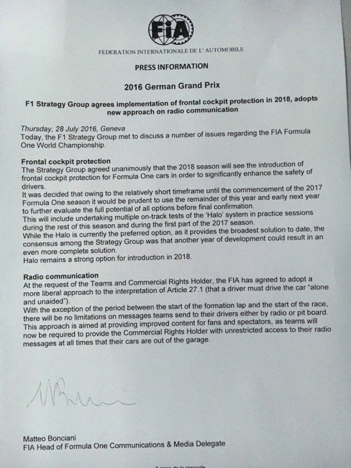 Στο περιθώριο του Grand Prix της Γερμανίας, το Strategy Group της Formula 1 συνεδρίασε προκειμένου να αποφασίσουν τι θα γίνει με το σύστημα προστασίας Halo και την ενδοεπικοινωνία.