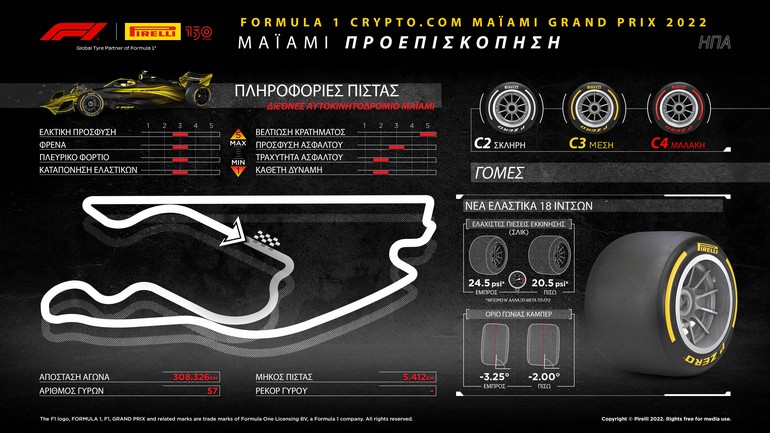Για το πρώτο αγώνα στους δρόμους του Μαϊάμι, η Pirelli επέλεξε τις τρεις μεσαίες γόμες της γκάμας της: Η C2 είναι η P Zero λευκή/σκληρή, η C3 είναι η P Zero κίτρινη/μέση και η C4 είναι η P Zero κόκκινη/μαλακή γόμα. Αυτός ο συνδυασμός είναι ο πιο συνηθισμένος κατά τη διάρκεια της χρονιάς, αλλά και αυτός που ταιριάζει στις περισσότερες περιπτώσεις.