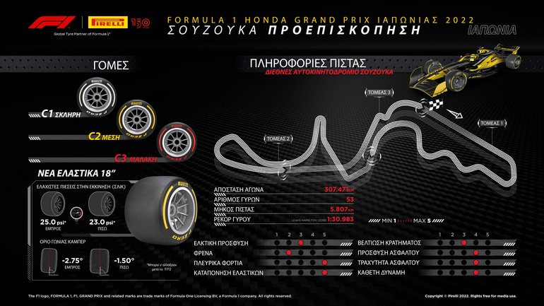 Η Pirelli στην Ιαπωνία για διαθέσει τις τρεις πιο σκληρές γόμες. Η C1 θα είναι η P Zero λευκή/σκληρή, η C2 θα είναι η P Zero κίτρινη/μέση και η C3 θα είναι η P Zero κόκκινη/μαλακή. Αυτή θα είναι και η τελευταία εμφάνιση της πιο σκληρής γόμας C1 φέτος.