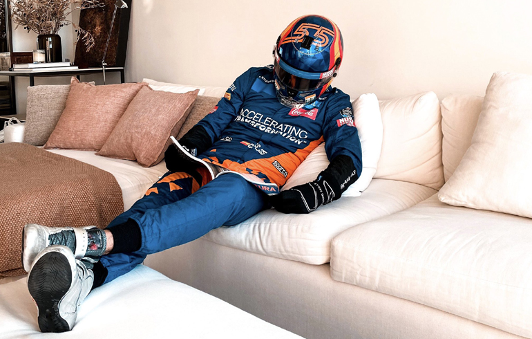 Ο Carlos Sainz jr. από την πλευρά του φαίνεται πως έχει βαρεθεί στο σπίτι να ανυπομονεί να επιστρέψει στις πίστες. Έτσι φόρεσε το κράνος, τη φόρμα και τα γάντια και άραξε στον καναπέ για να διαβάσει ένα περιοδικό, αφού δεν μπορεί να οδηγήσει το μονοθέσιο της McLaren.