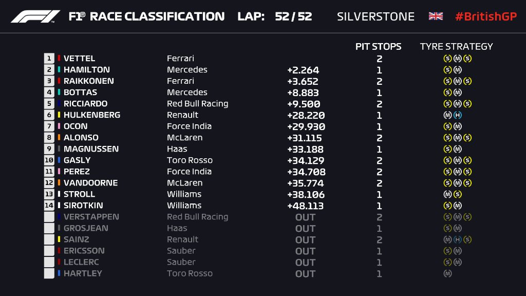 Στην δεύτερη θέση ολοκλήρωσε τον αγώνα ο Lewis Hamilton. Ο Βρετανός πιλότος της Mercedes ξεκίνησε πρώτος, έπεσε στην… τελευταία θέση έπειτα από επαφή που είχε με τον Raikkonen και εν τέλει μετά από έναν φοβερό αγώνα που έκανε μπροστά στους συμπατριώτες του ανέβηκε στο βάθρο. Μαζί του και μία θέση πιο πίσω τερμάτισε ο Kimi Raikkonen που ενώ δέχτηκε ποινή 10 δευτερολέπτων θύμισε κάτι από τον παλιό καλό του εαυτό.