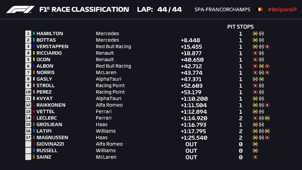 Με νίκη του Lewis Hamilton ολοκληρώθηκε το γκραν πρι του Βελγίου το οποίο πραγματοποιήθηκε στην π΄στα SPA. Ο πιλότος της Mercedes ξεκίνησε από Πιο… χάλια δεν γίνεται για τη Ferrariτην πρώτη θέση και χωρίς δυσκολία ήταν αυτός που κατάφερε να δει πρώτος την καρό σημαία του τερματισμού.