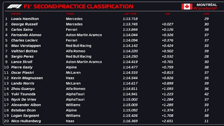 Αναλυτικά, η τελική κατάταξη του FP2 στο Μόντρεαλ: