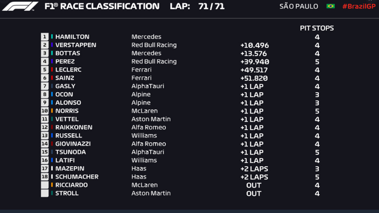 Ο αγώνας έληξε με τον Hamilton να κερδίζει έχοντας αποκτήσει διαφορά 10 δευτ. από τον δεύτερο Verstappen, με τον Bottas να τερματίζει τρίτος.