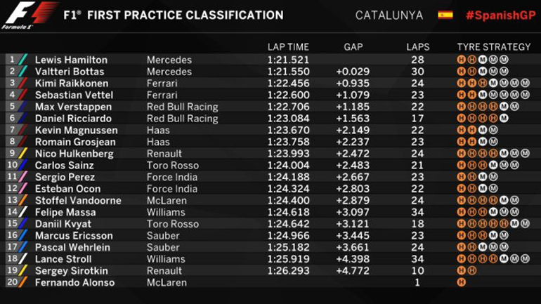 Οι πρωταθλητές έφεραν στην ισπανική πίστα ένα σημαντικό πακέτο αναβάθμισης, κάτι το οποίο εκμεταλλεύτηκαν πλήρως οι Lewis Hamilton και Valtteri Bottas. Αυτοί ήταν οι μοναδικοί που κατέβηκαν κάτω από το 1:22, με τη διαφορά που τους χωρίζει να είναι μόλις 0.029.