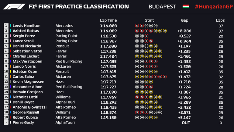 Στην πρώτη περίοδο των ελεύθερων δοκιμών του Grand Prix της Ουγγαρίας, οι δύο οδηγοί της Mercedes έκανε με διαφορά τους καλύτερους χρόνους και μάλιστα με τη σκληρή γόμα. Ο Sergio Perez της Racing Point ήταν τρίτος με διαφορά μισό δευτερολέπτου, αλλά με τα μαλακά ελαστικά και ο teammate του Lance Stroll τέταρτος.