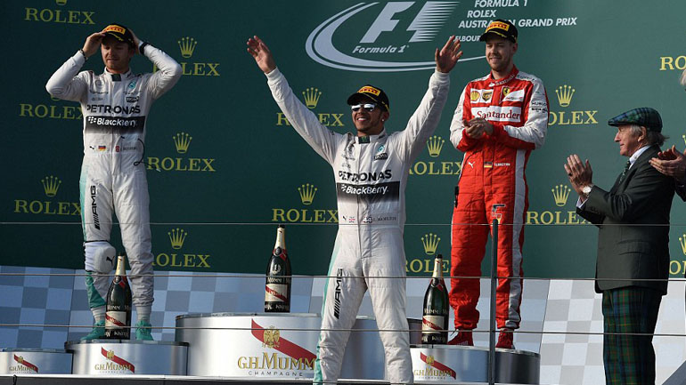 Ο Lewis Hamilton ως νικητής του αγώνα ήταν στη μέση, με τους Nico Rosberg και Sebastian Vettel να βρίσκονται δεξιά και αριστερά του. Οι δύο Γερμανοί οδηγοί είχαν μια έντονη στιχομυθία, με τον Βρετανό να χαμογελά αμήχανα συνεχώς. Όλα ξεκίνησαν όταν ο Rosberg είπε ότι θέλει πιο ανταγωνιστική τη Ferrari. O Vettel αντέδρασε άμεσα και η κουβέντα ξέφυγε από τα συνηθισμένα.