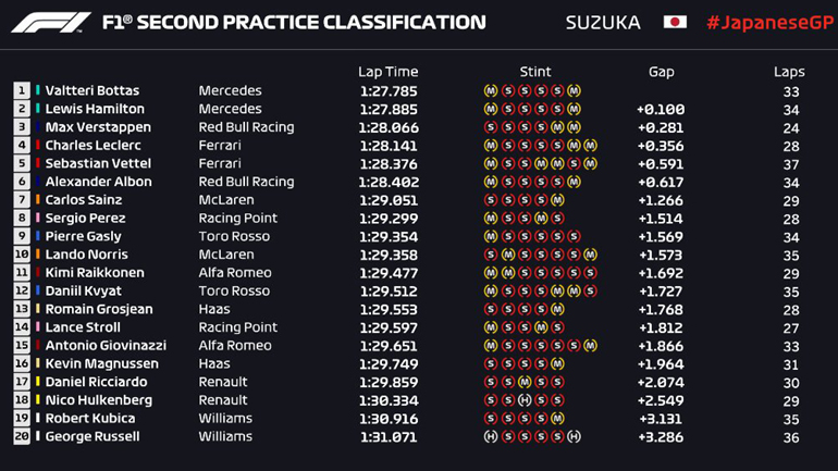 Στο FP2 η Mercedes κυριάρχησε απόλυτα, με τον Valtteri Bottas να είναι πιο γρήγορος από τον Lewis Hamilton. Τρίτος ήταν ο Max Verstappen, με τις δύο Ferrari να μένουν αρκετά πίσω.