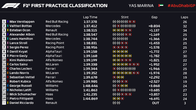 Βέβαια, ο Ολλανδός οδηγός φορούσε τα μαλακά ελαστικά, ενώ ο Φιλανδός της Mercedes την πιο σκληρή γόμα. Οι δύο τους ήταν οι μοναδικοί που κινήθηκαν στο 1.37. Η διαφορά με τους υπόλοιπους ήταν πάνω από 1 δευτερόλεπτο. Τρίτος ήταν ο Esteban Ocon με Renault και τέταρτος ο Alex Albon της Red Bull.