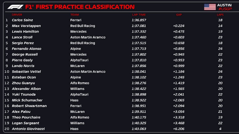 Χωρίς ούτε ένα μικρό συννεφάκι πάνω από την πίστα του Austin στο Τέξας της Αμερικής,έγιναν στις δύο το μεσημέρι (10 το βράδυ ώρα Ελλάδος) τα πρώτα ελεύθερα δοκιμαστικά της 19ης διοργάνωσης της F1 για το 2022 . Ο Ισπανός πιλότος της Ferrari ,Carlos Sainz ,έκανε τον καλύτερο χρόνο ενώ ο ήδη Παγκόσμιος Πρωταθλητής για φέτος, Max Verstappen αρκέστηκε στη δεύτερη θέση.