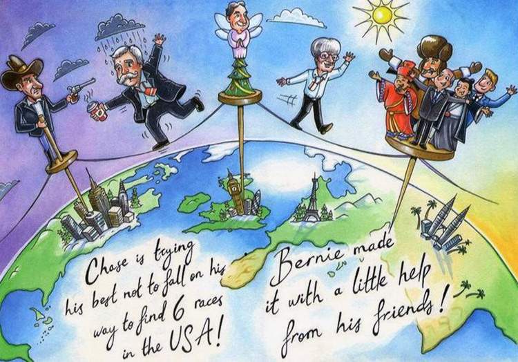 Ο Carey περπατά πάνω σε τεντωμένο σκοινί κοιτάζοντας προς την πλευρά των ΗΠΑ, έχοντας πάνω του ένα σύννεφο βροχής και απέναντί του έναν καουμπόι που τον απειλεί με όπλο. Από την άλλη, ο γερο-Bernie περπατά ανάλαφρα στο ίδιο σκοινί αλλά από την πλευρά της Ευρώπης, με τον ήλιο να λούζει με τις ακτίνες του αυτόν και τους φίλους του.