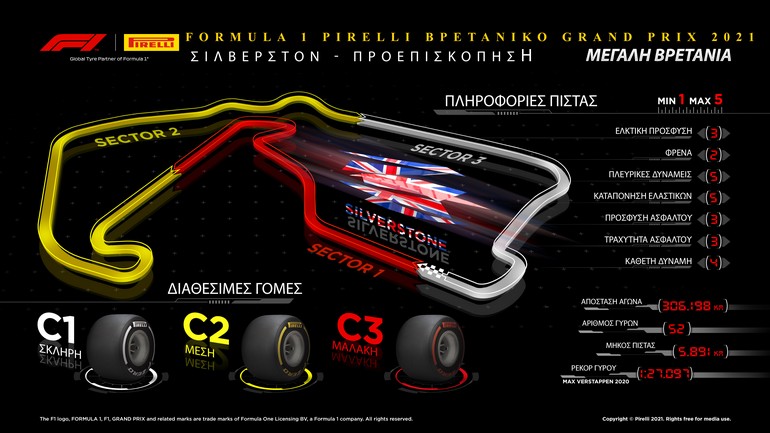 Στο Silverstone θα χρησιμοποιηθούν C1 η P Zero λευκή σκληρή γόμα, C2 η P Zero κίτρινη μέση γόμα και C3 η P Zero κόκκινη μαλακή γόμα.